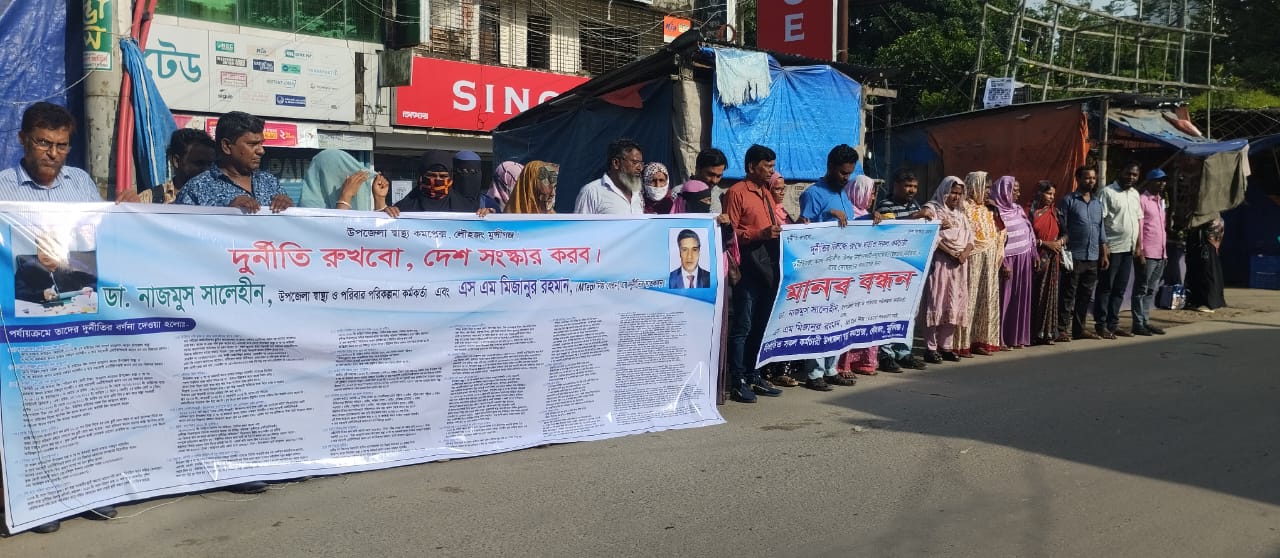 লৌহজংয়ে স্বাস্থ্য কর্মকর্তা ও মেডিকেল টেকনোলজিস্টের পদত্যাগের দাবিতে মানববন্ধন