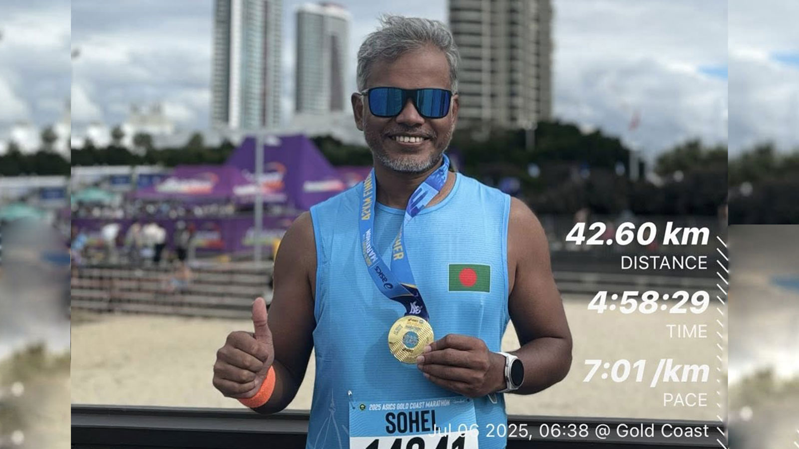 অস্ট্রেলিয়ার গোল্ড কোস্টে অনুষ্ঠিত আন্তর্জাতিক ম্যারাথন “𝗚𝗼𝗹𝗱 𝗖𝗼𝗮𝘀𝘁 𝗠𝗮𝗿𝗮𝘁𝗵𝗼𝗻 𝟮𝟬𝟮𝟱” সফলভাবে সম্পন্ন করেছেন বাংলাদেশি দৌড়বিদ ও চক্ষু চিকিৎসক ডা. মো: কামরুল হাসান সোহেল।